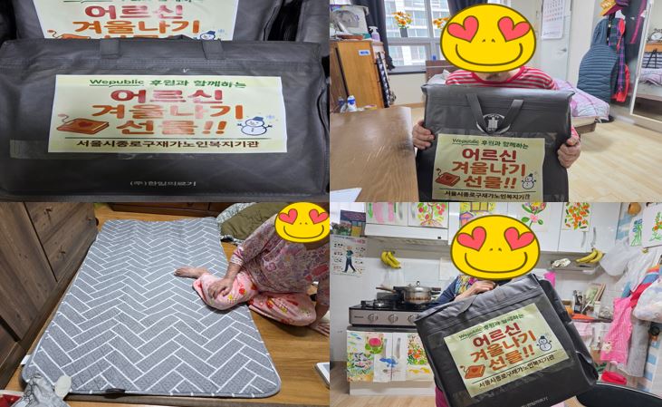 안녕하세요 서울시종로구재가노인복지기관입니다. 봄이 성큼 다가왔지만 꽃샘추위가 기승을 부리던 지난 2월 20일, 저희 기관은 위퍼블릭 후원자님들의 따뜻한 마음을 담아 홀로 지내시는 어르신 23분께 전기장판을 전달해 드렸습니다.낮에는 봄 햇살이 내리쬐어도 이른 아침과 밤이면 여전히 살을 에는 추위가 ...